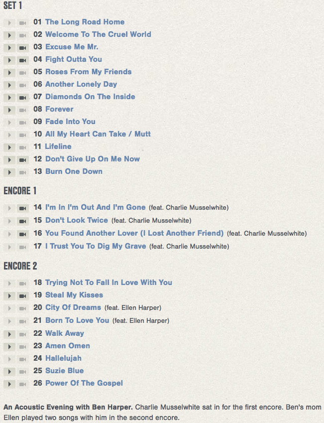 Ben Harper’s Setlist. Click To Enlarge.